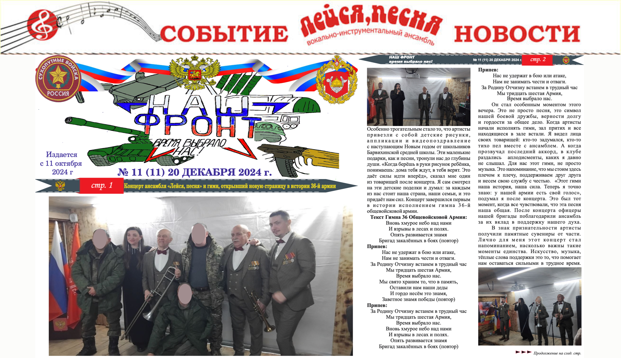 Кульминацией одного из концертов стало первое в истории исполнение Гимна 36-й общевойсковой армии. Композиция, созданная талантливыми музыкантами специально для этой части, прозвучала в авторском исполнении артистов ВИА «Лейся, песня», что сделало дебют произведения особенно ярким и запоминающимся событием. Это не просто песня, это символ нашей боевой дружбы, верности долгу и гордости за общее дело. Когда ансамбль начал исполнять Гимн 36-й ОА, зал притих и все находящиеся встали со своих мест. Я видел лица своих товарищей: кто-то задумался, кто-то тихо пел вместе с артистами. А когда прозвучал последний аккорд, раздались такие аплодисменты, каких я давно не слышал. Для нас этот гимн, не просто музыка. «Этот гимн наша история, наша сила. Теперь я точно знаю: у нашей армии есть свой голос». Это был тот момент, когда все почувствовали, что эта песня наша общая.